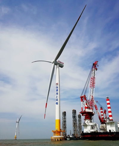 5月9日,上海臨港海上風(fēng)電一期示范項(xiàng)目首臺(tái)風(fēng)電機(jī)組成功完成吊裝,該機(jī)組為上海電氣6.25-172海上風(fēng)機(jī),是全球已吊裝的葉輪直徑最大的海上風(fēng)機(jī)。此機(jī)組葉片由中復(fù)連眾制造,單只葉片長84米,功率6.25兆瓦,是全球最長玻纖增強(qiáng)葉片。