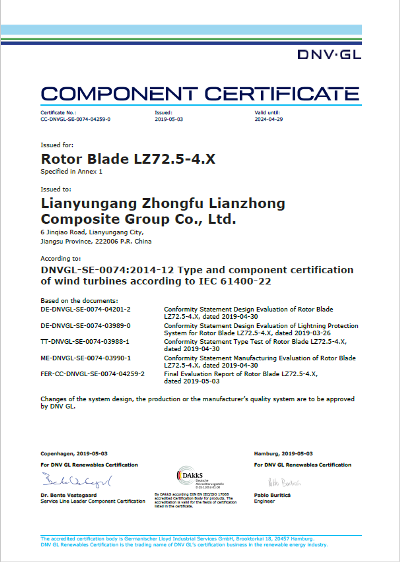 DNV GL是一家全球性的質(zhì)量保障和風(fēng)險(xiǎn)管理公司,是全球公認(rèn)的在風(fēng)力發(fā)電認(rèn)證領(lǐng)域最權(quán)威的檢測(cè)、認(rèn)證機(jī)構(gòu)。LZ72.5-4.X風(fēng)電葉片型式認(rèn)證項(xiàng)目從第一份設(shè)計(jì)資料提交到型式認(rèn)證證書(shū)獲取,歷時(shí)十個(gè)月,創(chuàng)造了國(guó)內(nèi)葉片型式認(rèn)證的新速度,歷經(jīng)設(shè)計(jì)評(píng)估、靜載測(cè)試、疲勞測(cè)試、后靜力測(cè)試、工廠制造能力審核、自研雷電系統(tǒng)部件測(cè)試等一系列的評(píng)估與驗(yàn)證,終于成功完成。