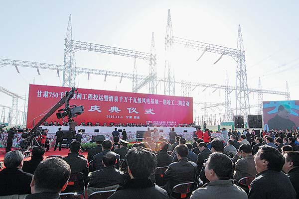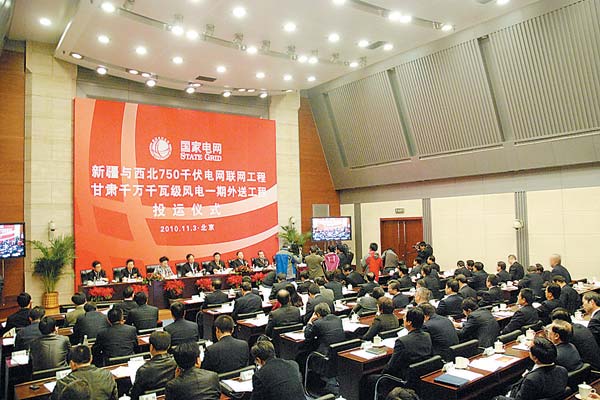 11月3日,在京舉行的新疆與西北750千伏電網(wǎng)聯(lián)網(wǎng)工程暨甘肅千萬千瓦級風(fēng)電一期外送工程投運(yùn)儀式。