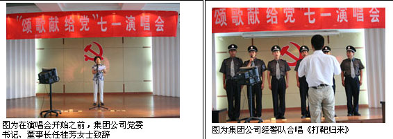 2007年6月30日,為了慶祝中國共產(chǎn)黨建黨86周年,集團(tuán)公司黨委在五樓多功能廳組織了“頌歌獻(xiàn)給黨 七一演唱會”。集團(tuán)公司全體黨員、行管人員、班組長以上干部參加了活動。在演唱會即將結(jié)束時,全體參會人員一起高歌《沒有共產(chǎn)黨就沒有新中國》將演唱會推向高潮,全體黨員干部將真抓實(shí)干,為完成2007年度公司各項經(jīng)濟(jì)指標(biāo)而努力奮斗,為黨的十七大獻(xiàn)禮。