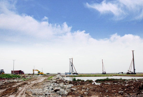 工程部徐經(jīng)理介紹到,中復(fù)新水源徐圩項目是徐圩新區(qū)基礎(chǔ)建設(shè)工程,包括一個面積為139.7畝的水廠,一個面積為144畝的污水處理廠和外圍配套管網(wǎng)120公里,總工期14個月。項目部組建已經(jīng)一個月了,項目前期建設(shè)事宜正在按計劃推進,專家隊伍、管理隊伍已經(jīng)就位;樁基工程正在施工;土建工程已經(jīng)發(fā)出招標(biāo)公告;設(shè)備正在編制清單和技術(shù)規(guī)格書。項目地處徐圩鹽田,地質(zhì)條件復(fù)雜,地表至負(fù)13米左右均為淤泥層,承載力差,累計要打下十萬多米的樁基。