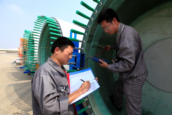 目前中復(fù)連眾生產(chǎn)的葉片最短的有34米,最長的達(dá)到超過60米,這就造成擺放這些葉片的場地非常大,連云港生產(chǎn)基地的貨場大約300畝。廣闊的貨場繞行一周至少需要半個小時,工作內(nèi)容暫且不說,光是每天在貨場上來回走上幾趟,很多人都吃不消,加上酷暑寒冬,風(fēng)吹雨淋,讓人望而生畏。葉片噴漆完畢到等待發(fā)貨這段時間,賈效博會將對葉片進(jìn)行航空標(biāo)識、內(nèi)部檢查、后緣厚度、螺栓、葉片翼型檢查、人孔板等14個大類60多小項的檢查,從根部到尖部,從外表面到葉片內(nèi)里,有的需要肉眼觀察,有的需要儀器測量,需要嚴(yán)格對照工藝要求,逐項檢查,對檢查到的不合格項還要反饋給相關(guān)部門,請他們處理,然后再進(jìn)行一輪檢查,直至符合出廠標(biāo)準(zhǔn)。遇到發(fā)貨時間比較急,或者是出口訂單,他的任務(wù)就更艱巨了,加班加點(diǎn)不說,對同一只葉片他要看好幾次,確認(rèn)沒有問題了,他才會給客戶監(jiān)理看。