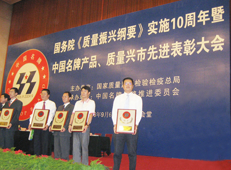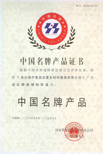 2006年9月6日,由國家質(zhì)量監(jiān)督檢驗(yàn)檢疫總局主辦,中國名牌推進(jìn)委員會(huì)承辦的國務(wù)院《質(zhì)量振興綱要》實(shí)施十周年暨中國名牌產(chǎn)品、質(zhì)量興市先進(jìn)表彰大會(huì)在北京人民大會(huì)堂順利召開。中復(fù)連眾生產(chǎn)的“連眾”牌玻璃鋼管道喜獲“中國名牌”稱號(hào),喬光輝總經(jīng)理上臺(tái)領(lǐng)取了獎(jiǎng)牌和證書。這是暨2005年獲得江蘇省著名商標(biāo)以來“連眾”牌玻璃鋼管道獲得的又一殊榮。