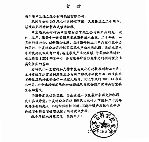 金秋十月,恰逢中復(fù)連眾3.0MW風(fēng)力機(jī)葉片暨二十周年。近日來(lái),江蘇省科技廳、甘肅酒泉肅州區(qū)委區(qū)政府、巨石集團(tuán)等單位發(fā)來(lái)賀信,對(duì)中復(fù)連眾表示祝賀。