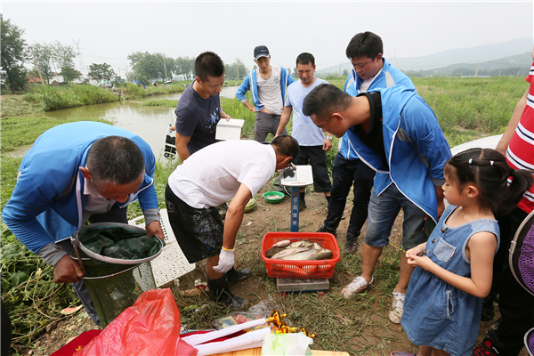 盡管烈日當(dāng)空,仍無法阻擋釣魚發(fā)燒友的熱情,大家早早地在魚塘邊支起了遮陽傘,拿出了自己的裝備,在水邊悠然開始釣魚。時間靜靜流過,全場釣友們緊繃著每一根神經(jīng),隨著一聲輕呼,我們的第一個幸運兒產(chǎn)生,拉起了一條肥美的魚兒;大家無一不為其鼓掌致賀,同時內(nèi)心也被激起一股勝負(fù)欲,摩拳擦掌、躍躍欲試。突然,爆發(fā)一聲聲驚呼,引來大家的圍觀,原來是葉片一二分廠的張志強釣到了約半米長的大魚,一上稱凈重7.5斤,拔得了今天的“魚王”頭籌;“一丈青竹一丈線,一點猩紅碧水間?!敝筚悎鲩g或引發(fā)陣陣呼聲,每一位釣友都收獲頗豐。