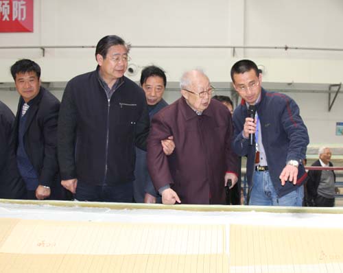 中復連眾副總經(jīng)理王彤兵首先對省級老干部考察團的到來表示歡迎,并向考察團介紹了中復連眾風力發(fā)電機葉片的生產(chǎn)工藝。目前中復連眾生產(chǎn)的風力發(fā)電機葉片主要基材為環(huán)氧樹脂,產(chǎn)品設計使用壽命為20年。去年年底中復連眾已成功躍居國內(nèi)最大的兆瓦級風力發(fā)電機葉片生產(chǎn)企業(yè),2008年計劃生產(chǎn)750套風力發(fā)電機葉片。
