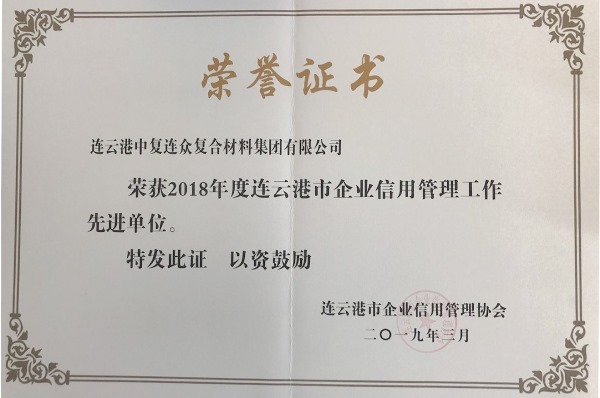喜訊:中復連眾獲2018年度連云港市信用管理先進單位