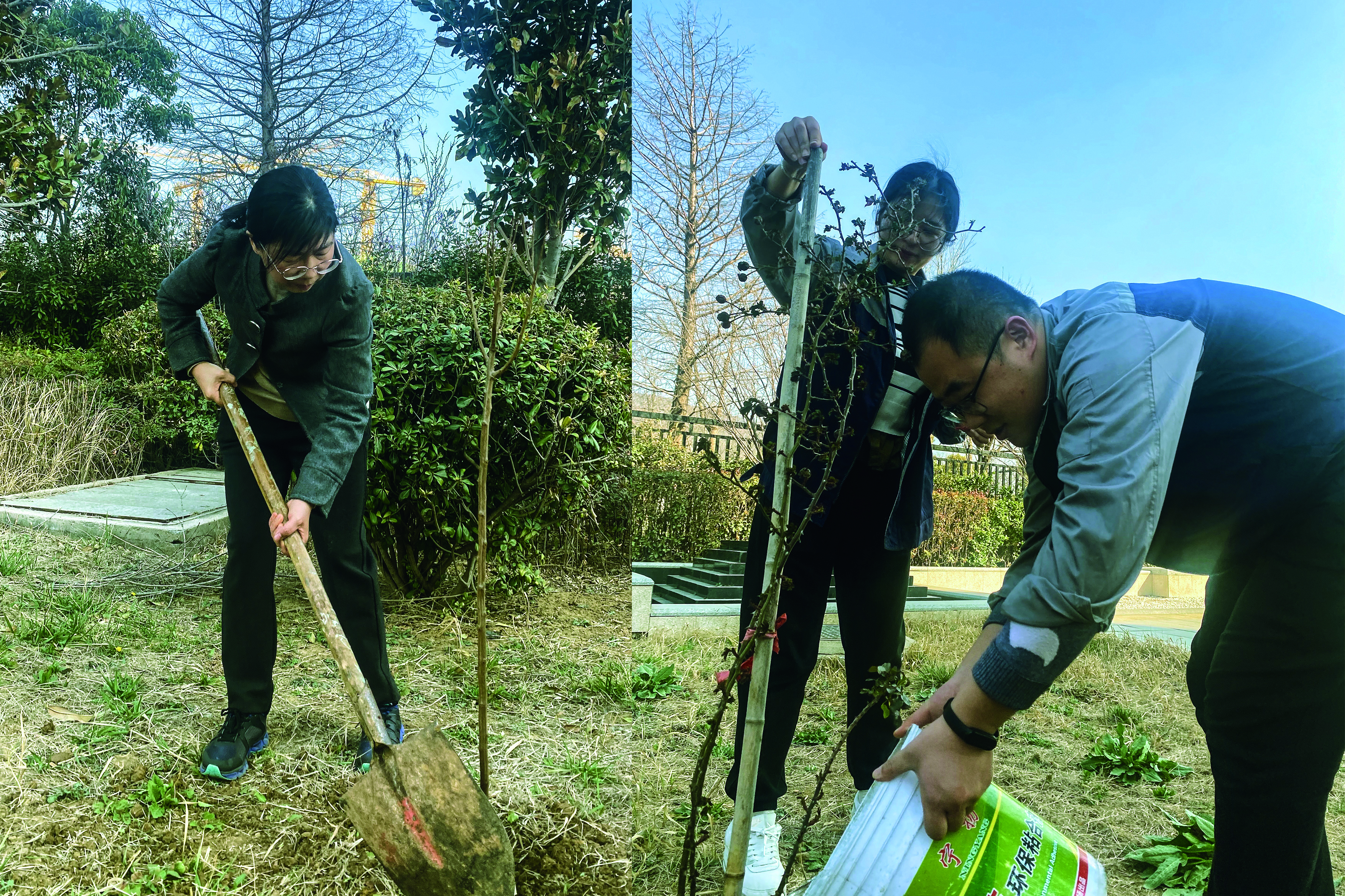 活動(dòng)分別設(shè)在科研樓和連云港葉片工廠大浦工廠,科研樓現(xiàn)場主要是栽新苗增綠,大浦工廠現(xiàn)場主要是移苗護(hù)綠。在栽苗現(xiàn)場,大家手持鐵鏟、分工協(xié)作,有的揮鏟掘坑、有的扶苗校正、有的培土圍堰、有的提水澆灌……每個(gè)環(huán)節(jié)都井然有序,每道工序都認(rèn)真細(xì)致、一絲不茍,確保栽一棵活一棵。在挖苗現(xiàn)場,大家在保護(hù)好樹苗根部的前提下將樹苗挖起,并借助工具車將樹苗移至新地栽種,集中力量對移植的樹木做好澆水定根工作,確保移一棵活一棵。本次活動(dòng)大家相繼種下了大葉女貞、山楂、薔薇、月季等20余棵不同種類的苗木,青翠的樹苗在明媚的陽光中迎風(fēng)而立,展現(xiàn)出盎然生機(jī)和蓬勃活力。