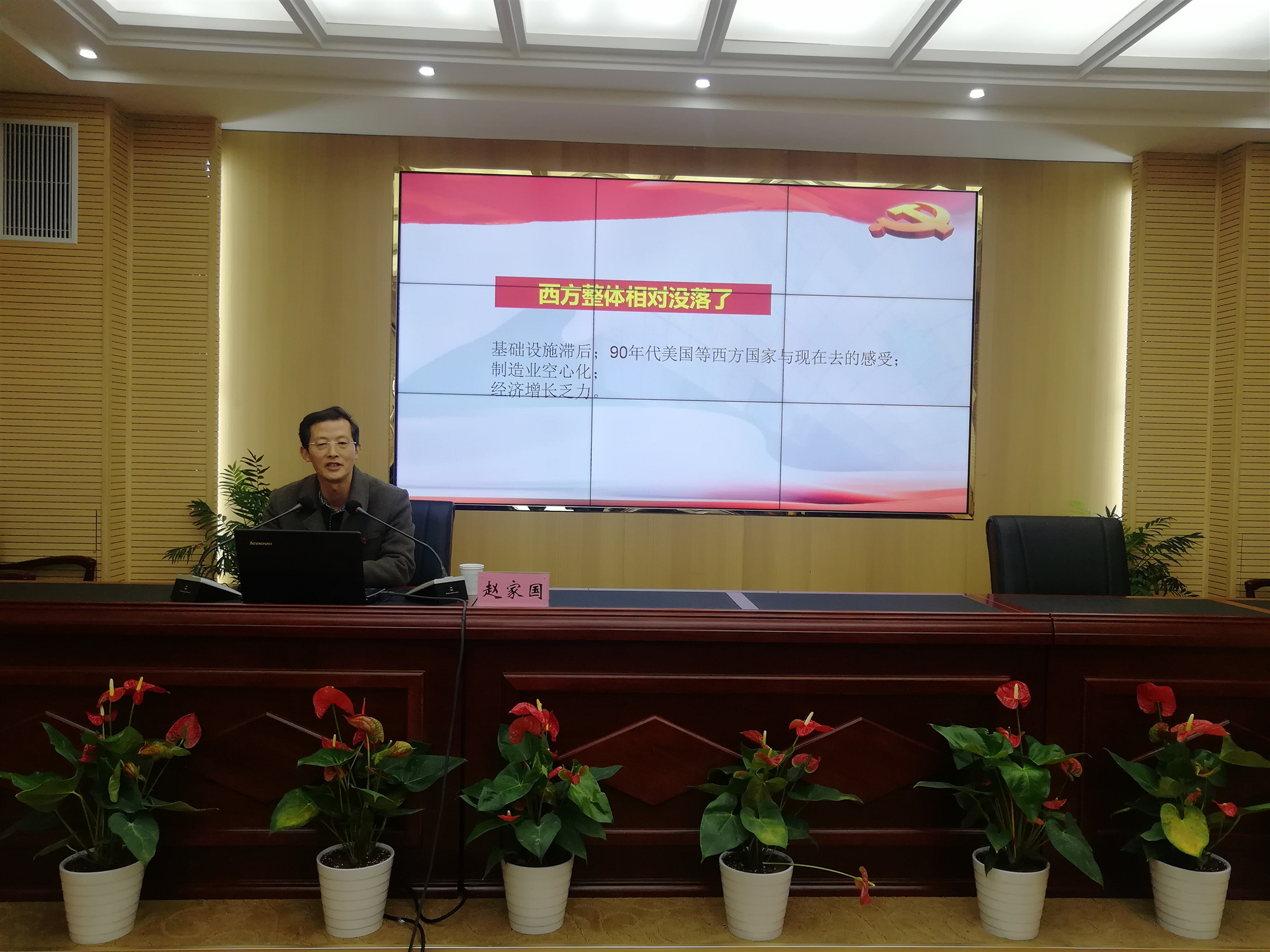接著,趙家國教授以“12345”為提綱挈領(lǐng),結(jié)合國內(nèi)國外形勢,為大家詳細解讀了黨的十九屆五中全會精神的精髓和要義?!?”是一個重大判斷揭示未來發(fā)展環(huán)境異常復(fù)雜:《建議》提出當前和今后一個時期,我國發(fā)展仍然處于重要戰(zhàn)略機遇期,但機遇和挑戰(zhàn)都有新的發(fā)展變化。“2”是兩個全局了然于胸謀劃未來:《 建議》指出全黨要統(tǒng)籌中華民族偉大復(fù)興戰(zhàn)略全局和世界百年未有之大變局,深刻認識我國社會主要矛盾變化帶來的新特征新要求....。我們從這兩個大局出發(fā)來制定規(guī)劃?!?”是三個“新”揭示新征程無比豪邁:新階段、新發(fā)展理念、新發(fā)展格局?!?”是四個首次展現(xiàn)復(fù)興圖強雄心壯志:堅持創(chuàng)新在我國現(xiàn)代化建設(shè)全局中的核心地位,首次把全體人民共同富裕取得更為明顯的實質(zhì)進展作為遠景目標提出,首次明確了建成文化強國的具體時間表,明確提出到2035年建成文化大國,首次提出確保二〇二七年實現(xiàn)建軍百年奮斗目標?!?”是五大原則體現(xiàn)黨的領(lǐng)導(dǎo)更加成熟高超:堅持黨的全面領(lǐng)導(dǎo),堅持以人民為中心,堅持新發(fā)展理念,堅持深化改革開放,堅持系統(tǒng)觀念。