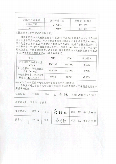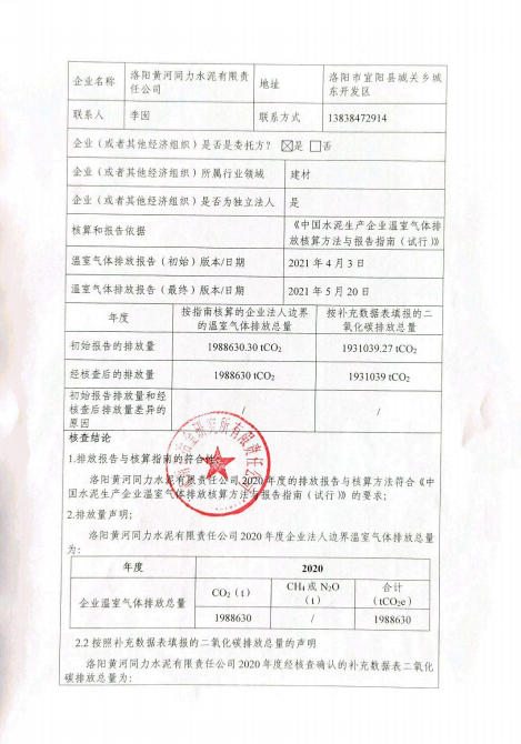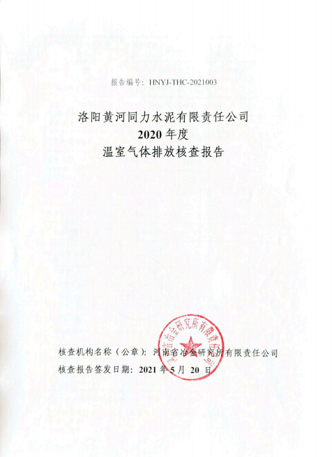 洛陽黃河同力水泥有限責(zé)任公司2020年度溫室氣體排放核查報告